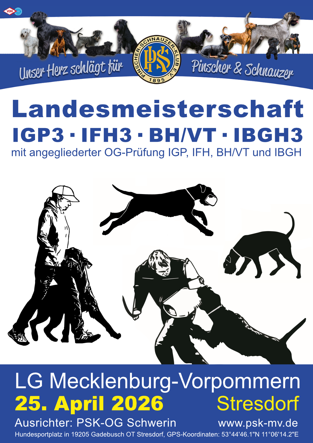 Am 25.April 2026 sind wir Ausrichter der PSK-Landesmeisterschaft IGP, BH/VT, IBGH und der OG-Prüfung